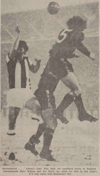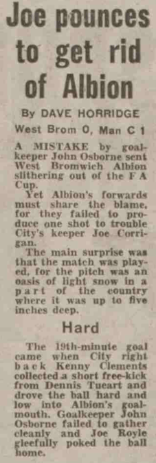 Royle’s goal came in the 19th minute on the snow at the Hawthorns in a game that many people felt should never have started, though City were not going to complain about that once they had control of the match. According to some reports Albion didn’t have a single shot in the match.