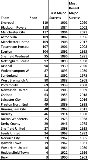 Following Manchester City’s victory in the League Cup last Sunday (April 25 2021) I’ve updated the table showing the span of success (above) – i.e. the number of years between a club’s first major success (FA Cup, League, League Cup, European trophy) and their most recent. Despite the win City remain third behind Liverpool and … Continue reading The Span of Success