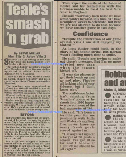 On this day (31 December) in 1994 Uwe Rosler netted twice to help Manchester City to a 2-2 draw at Maine Road. However, the Blues had been 2-0 up at one stage and the general feeling around Maine Road was that this was a couple of points lost, rather than a point gained. Here’s a couple of contemporary reports of the game: