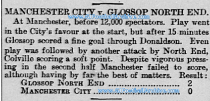 On this day (2 January) in 1899 there was a great deal of celebration in Glossop after they defeated their local rivals and fellow promotion challengers Manchester City 2-0 at Hyde Road with the Glossop Chronicle reporting: ‘There was evidently a determination to give the Mancunians a great surprise.’ Here’s a contemporary report of the … Continue reading Glossop Beat City!