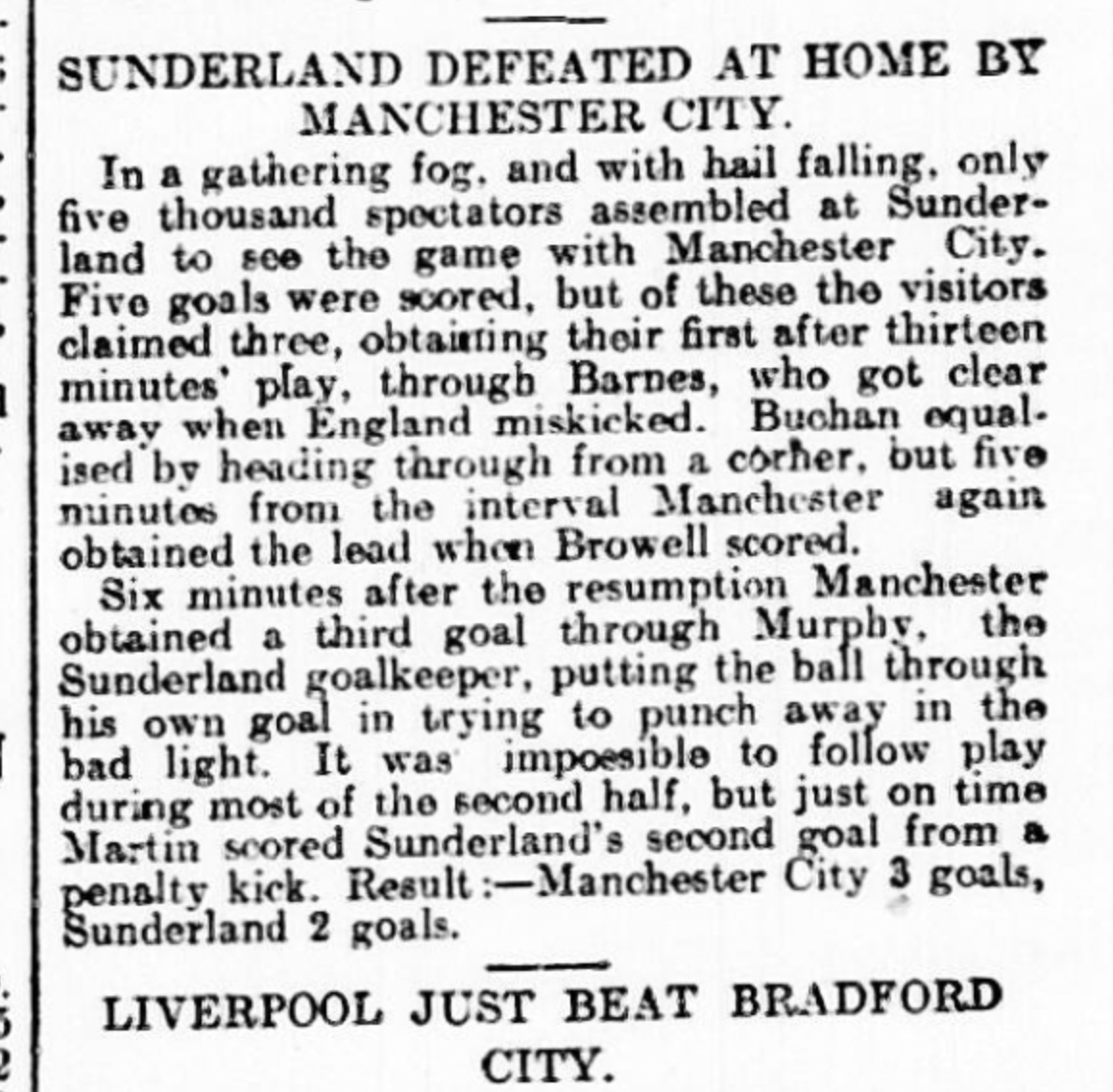 100 years ago today (16 January) the previous Saturday’s game between Manchester City & Sunderland was reported on. The game had ended in a 3-2 City win at Roker Park. The weather was poor, affecting the attendance and, as this report shows, preventing the reporter from being able to report properly on the game.