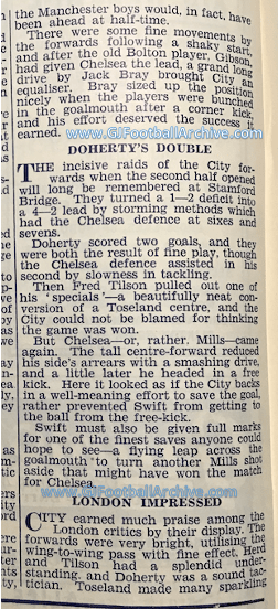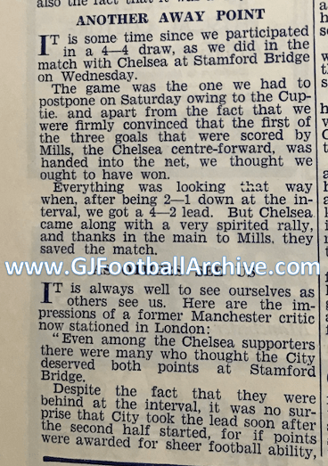 On this day (3 February) in 1937 the champions to be Manchester City drew 4-4 at Chelsea. Here are the comments from City about this game and how it was received in London too. Enjoy: