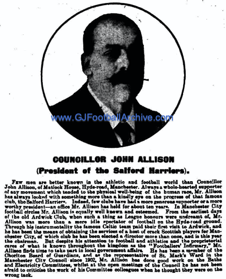 Continuing the series of ‘True Blue’ figures associated with the early years of Manchester City, here’s an article on John Allison who was a key figure with Ardwick AFC, Manchester City, Salford Harriers and also at Celtic. You can find out why this man was such an important figure in Manchester City history below: The … Continue reading True Blues – John Allison