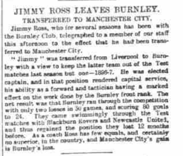 On this day (24 February) in 1899 the great Jimmy Ross signed for Manchester City. Ross was one of football’s leading names and earliest heroes when he played for the famous Preston side that won the League and Cup double of 1889. He had scored an incredible eight goals when Preston beat Hyde 26-0 in the record … Continue reading The Great Jimmy Ross