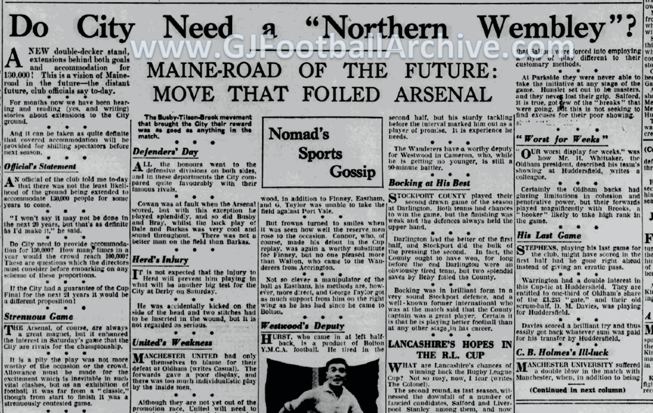 Day 57 of my posts counting down to the centenary of Maine Road’s opening game is a follow on from yesterday. It’s a cutting from the same newspaper, which was produced shortly after City and Arsenal had met at Maine Road in February 1935. It also follows on from some recent articles about stadium improvements. … Continue reading Maine Road 100 – Day 57