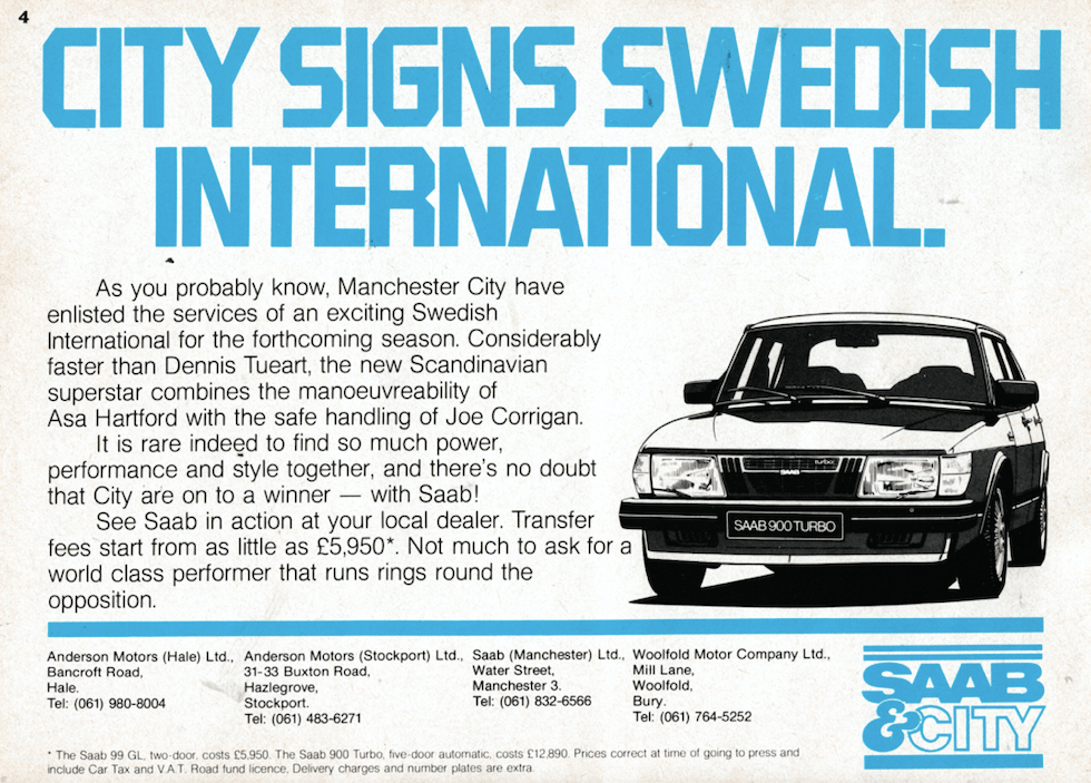 On this day in 1982 Manchester City should have played their first League game with a sponsor’s name on their shirt. However the match was televised and in those days TV did not allow clubs to wear sponsors names in televised games. The match was a 2-1 win away at Norwich and City’s first sponsor was the car company Saab.
