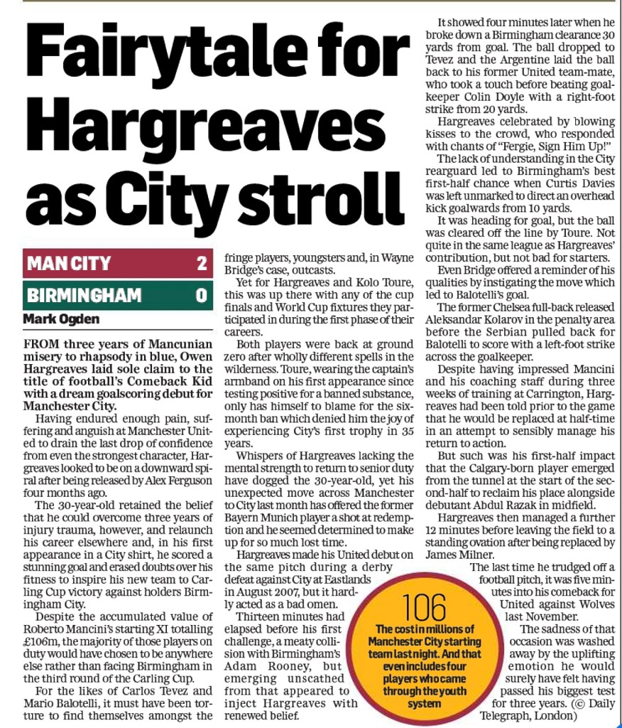 Here’s a match report from Owen Hargreaves’ Manchester City debut on this day (21 September) in 2011. The game ended 2-0 to Manchester’s Blues and was a League Cup tie. Mario Balotelli scored the other City goal. Notice the comments about the cost of City’s squad – yes, it really has been going on this long!