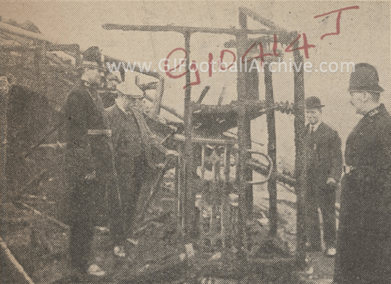 Only a few months after the King had visited Manchester City suffered a major blow when their Main Stand was destroyed by fire (6 November) 1920. Subscribers can read the story of this below (including the story of how City asked United if they could use Old Trafford temporarily which resulted in significant criticism of the Reds in national newspapers) but here’s a rare image that hasn’t been published in any Manchester City publication over the last century or so. It did appear in a contemporary newspaper. Notice the Ellison’s Rush Preventive turnstile that seems to have just about survived.