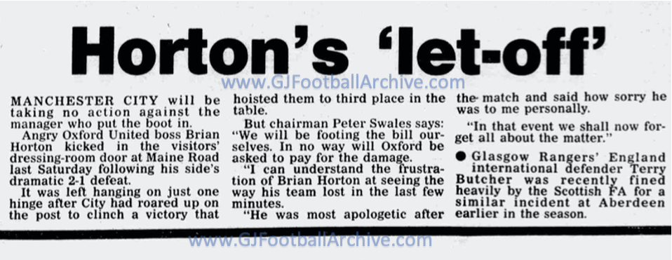 The series of articles covering Manchester City in the 1980s continues today with a reminder of the day Brian Horton damaged the Maine Road away team dressing room door. Future City boss Horton was then the manager of Oxford United. This article from this day (3 December) in 1988 explains how he was unhappy following his team’s dramatic 2-1 defeat the previous Saturday. City had been losing 1-0 with only a few minutes to go and then two dramatic late goals gave the Blues the victory. You can watch highlights here: