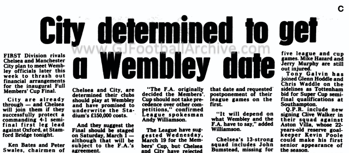 The issue was that the competition needed a Wembley final to add some credibility to it and both City and Chelsea were determined this would take place at a weekend. The preferred date was 1 March 1986 but this required clubs to postpone fixtures as the article suggests. What was not realised on 17 December 1985 was that City’s opponents on 1 March would object. Why? Well, City’s opponents were Oxford and they were the team that Chelsea had to beat to reach the national final. Had Oxford won then it seems likely they would have had no objection to rearranging their League game with City, but once Chelsea beat them the chance of City getting their preferred date was never going to happen.