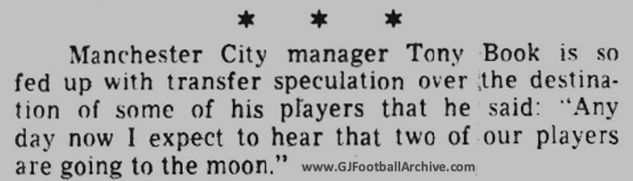 We often think that January transfer speculation is a modern phenomenon but back in the 70s it was a ‘thing’ too. Back then the transfer deadline was usually in March but FA Cup defeats or even challenges often led to speculation that players would be moving on. On this day (18 January) in 1975 it was reported that Manchester City boss Tony Book was so fed up of transfer speculation that he expected to hear that a couple of his players were off to the moon! City had been knocked out of the FA Cup and it’s possible that prompted all the speculation.
