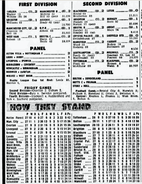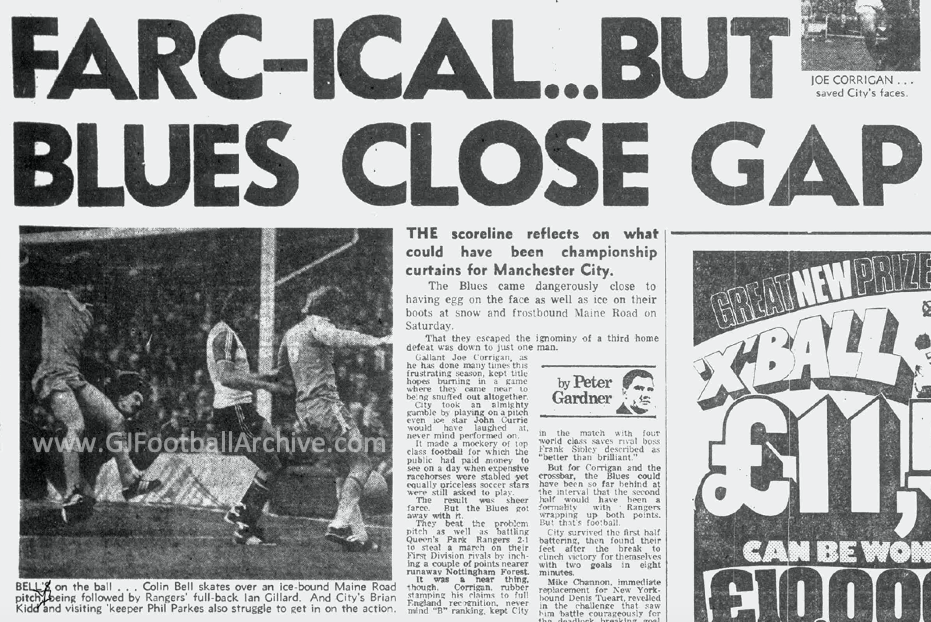 The series of features/articles covering Manchester City in the 1970s continues with this brief reminder of a day when icy conditions brought chaos to many grounds. City managed to get their game against QPR on and it was played on this day (11 February) in 1978. City still had ambitions to catch League leaders Liverpool. There’s a report of the game and post match League table below but the highlights were that Corrigan made some significant saves; Bell scored his first goal since his return on Boxing Day and Mike Channon scored the other in a 2-1 City victory.