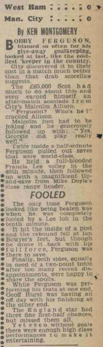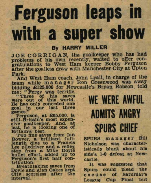 On this day (20 February) in 1971 Manchester City played out a goalless game at West Ham United. Often games without goals are perceived as dull but this match was full of goal action – even if no actual goals were scored. The brilliance of West Ham’s ‘keeper ensured Manchester City could not score and at the end of the game City’s Joe Corrigan ensured he congratulated Ferguson, even if Malcolm Allison joked that he had no idea who journalists were talking about when they asked him about the Hammers’ goalie. Here’s a report of the game: