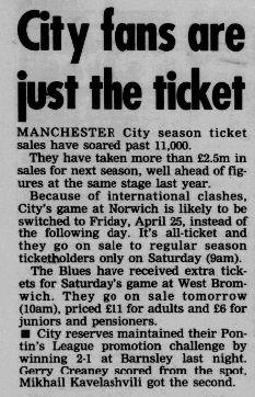 The series of features covering Manchester City in the 1990s continues today with this reminder of the loyalty of fans. This cutting is from today (8 April) in 1997 and highlights that season ticket sales had increased to 11,000 at this stage of the season. In those days there wasn’t a cut off but there were different pricing structures, so if you bought early you’d get the best benefit.