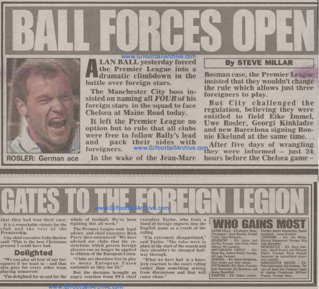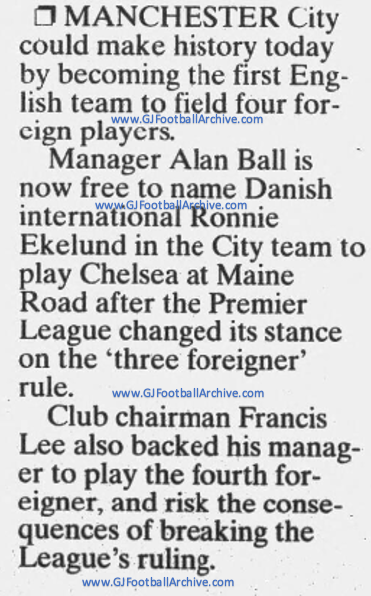 The Premier League, supported by the FA, said the ruling meant that City and other clubs could play as many EU players as they wanted. At Maine Road Alan Ball had brought Danish under-21 international Ronnie Ekelund on loan and together with Eike Immel, Uwe Rosler and Georgi Kinkladze it was suggested he would play against Chelsea on 23 December 1995.