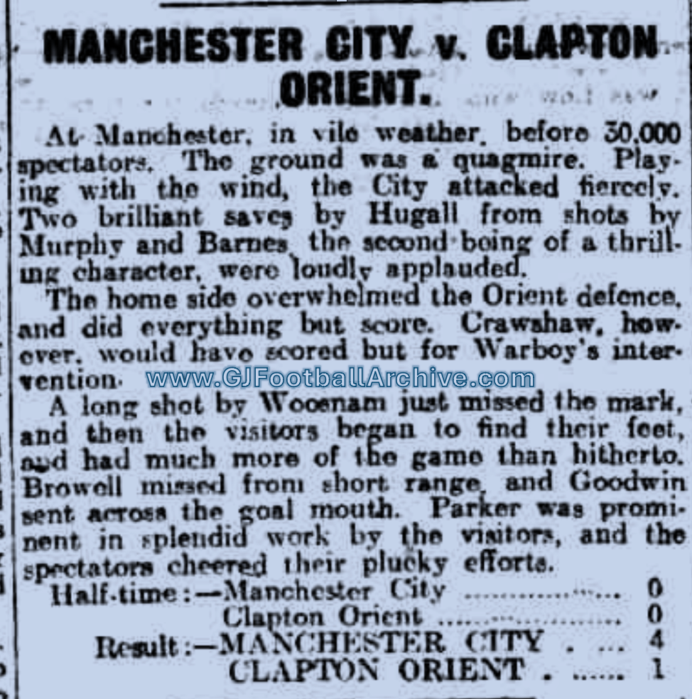 Today marks the latest game between City and Orient. They first met in 1909 when Orient won 3-2 on 18 September. The first FA Cup tie between the clubs came on 10 January 1920 when City defeated Orient 4-1 with goals from Ernie Goodwin (2), Horace Barnes and Billy ‘Spud’ Murphy (see report). The most recent match between the teams came on 7 May 1966 when a Second Division game ended 2-2 (City scorers were Colin Bell and an own goal from Sorrell).