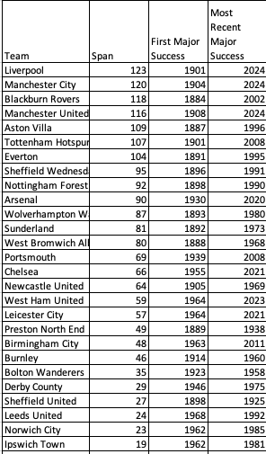 As I always say, the span of success does not show how many trophies each club has won or how frequently that club has experienced great eras of success, but it does demonstrate how wrong those people are who believe certain clubs were unsuccessful until recent years, or those who think certain clubs have always been giants. The column on first major success helps to show when some clubs first became trophy-winning significant (often after transformational investment too!).