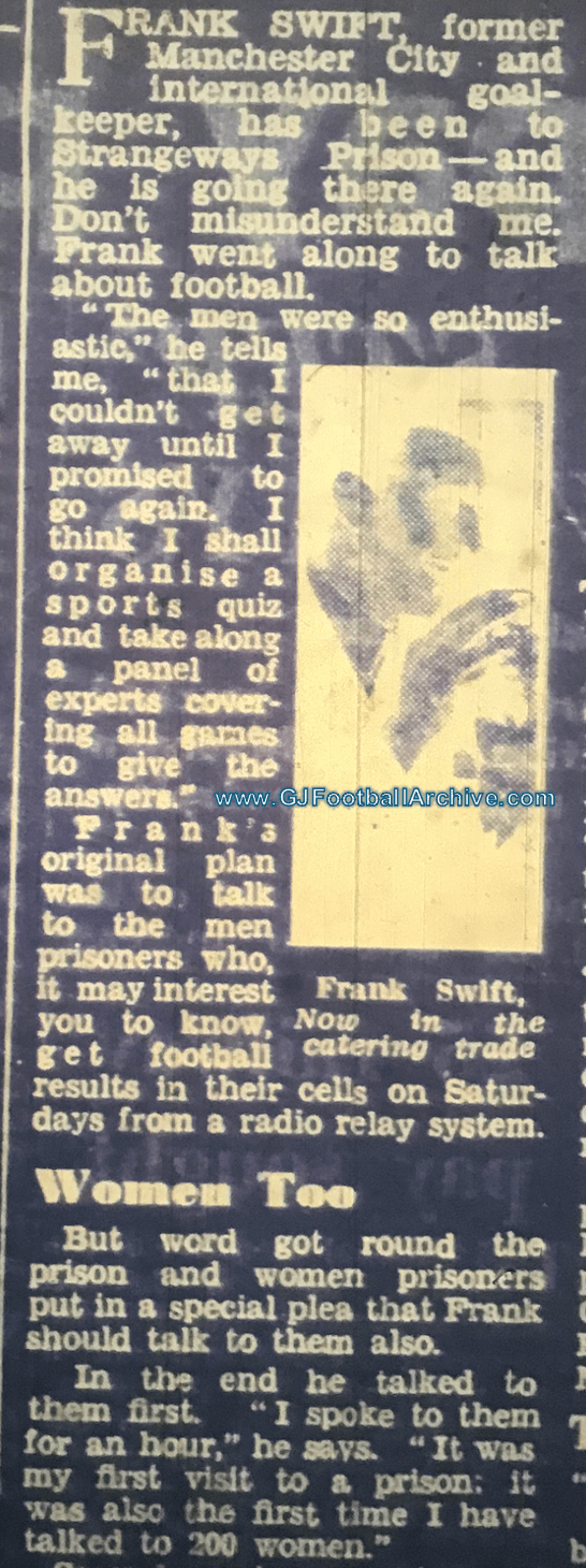On this day (4 October) in 1949 it was reported that Frank Swift went to Strangeways prison… to talk to inmates about football. He assumed he would be just talking to the male prisoners but there was so much interest from the female inmates that he spent some time with them first. He talked about his career; City and United and whether Billy Meredith or Stanley Matthews was the greatest all-time forward apparently.