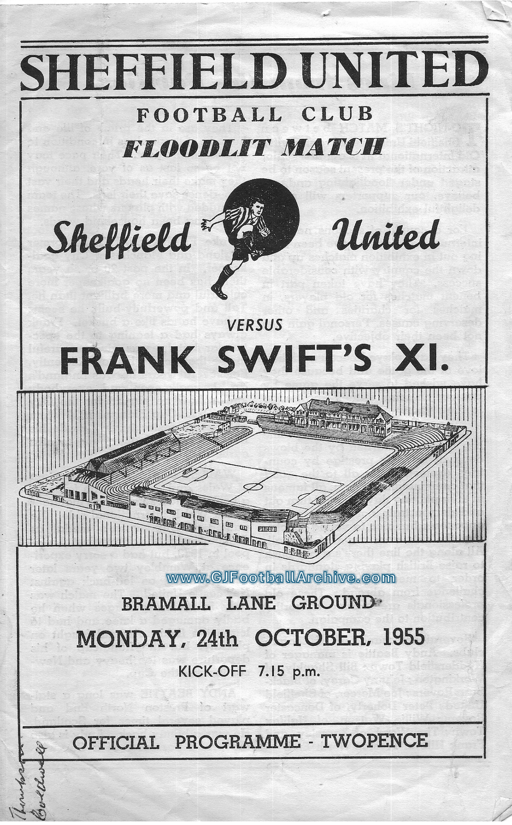 Here’s an interesting piece of floodlit football history from 70 years ago. On 24 October 1955 Joe Mercer’s Sheffield United played a team of former internationals selected by Frank Swift, the ex-Manchester City ‘keeper. Mercer was selected by Swift to play for the old internationals against the team he was manager of.