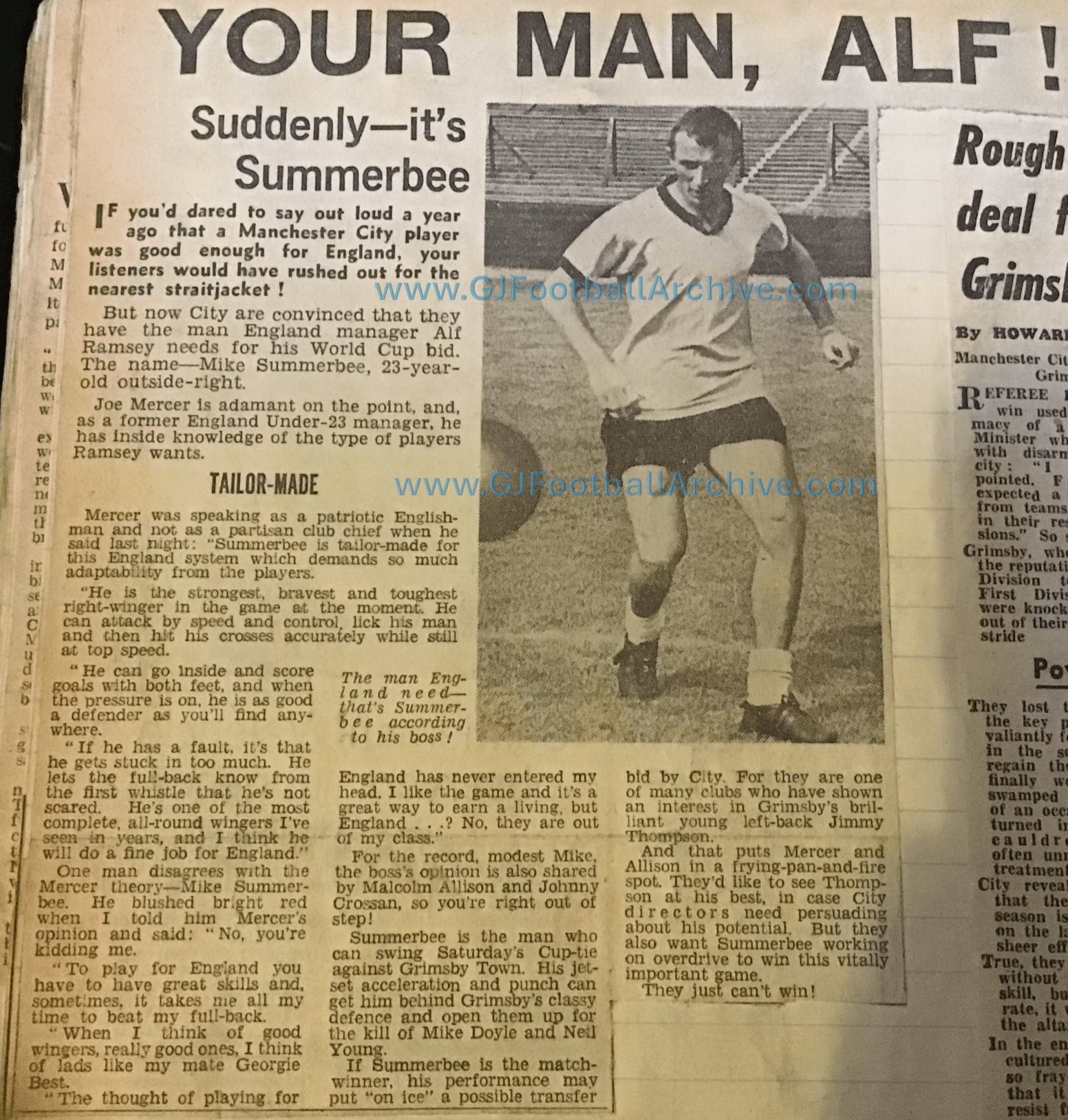 This week in 1966 Manchester City manager (and future England boss) Joe Mercer told journalists that he believed that Mike Summerbee was ready to play for England. Mercer felt Summerbee could play in the following summer’s World Cup and urged Alf Ramsey to pick the City star. You can see one of the many articles published about this here. As for Mike Summerbee… Summerbee was flattered and slightly embarrassed about Mercer’s claims but many neutrals believed the City star deserved the opportunity.