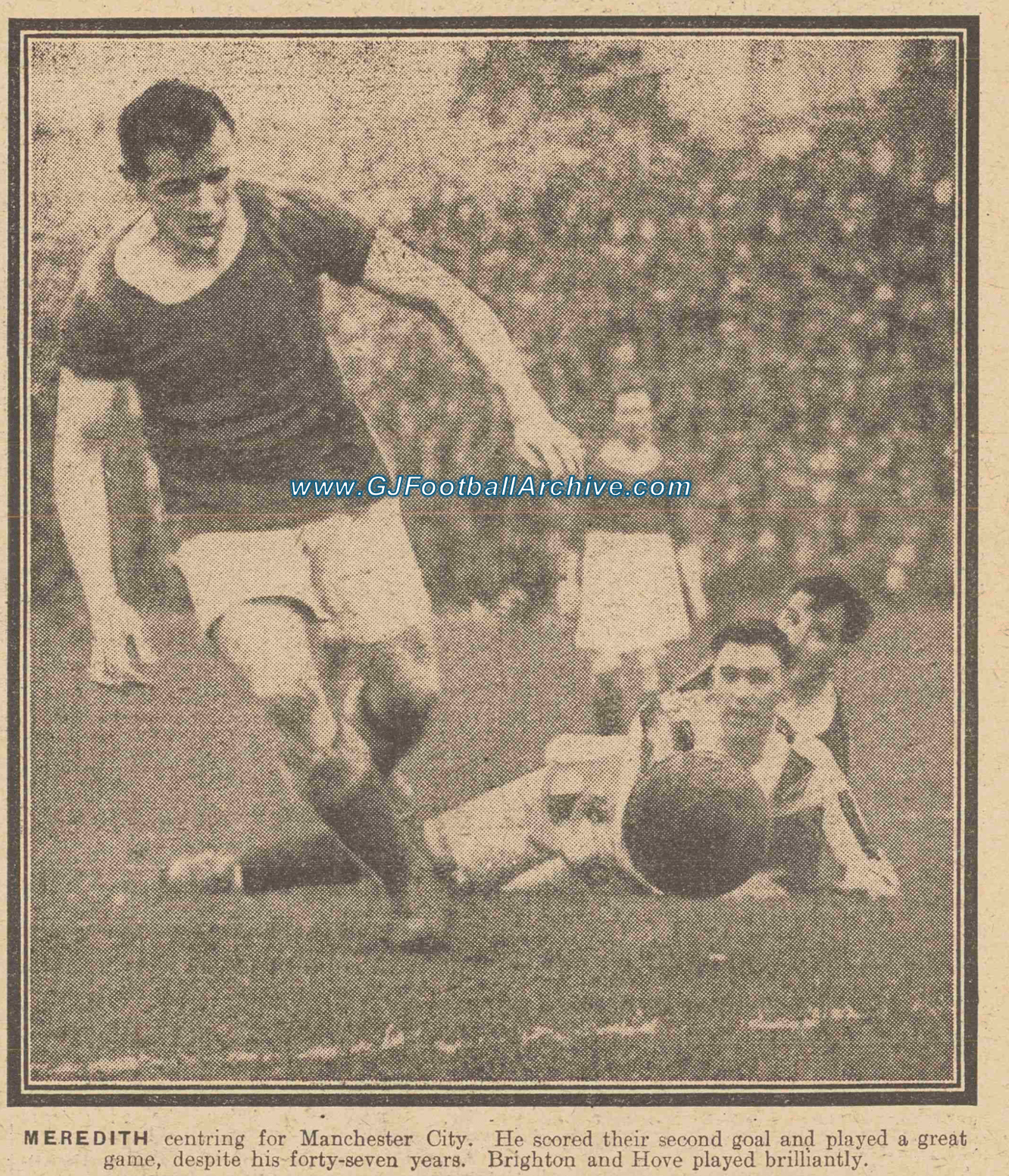 A record crowd of 24,734 packed into Brighton’s Goldstone Ground and Meredith’s inclusion inspired the rest of the team. City defeated Brighton 5-1 and there was even a sentimental moment when a minute into the second half Meredith scored. The Daily Mail described the goal: ‘[Meredith’s] old inimitable ball magic along the touch line remains… Those bow legs still mesmerise the ball, and that great right foot still placed the ball perfectly in the mouth of goal. In this way Meredith got his goal. Hayes grasped the ball, but it spun out of his hands into the net.’