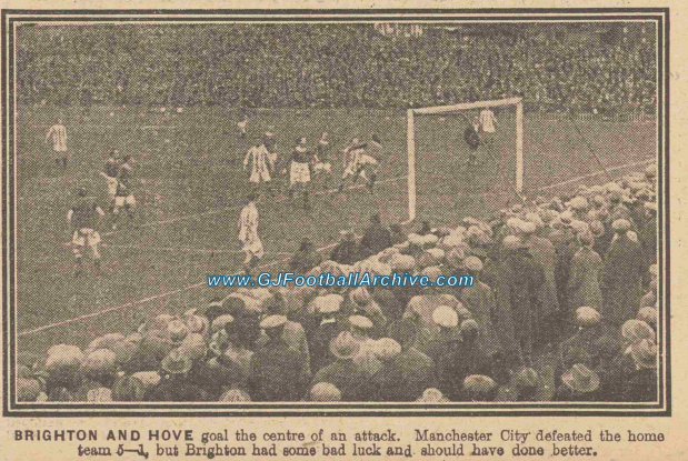 The first ever meeting between City and Brighton was on this day (23 February) in 1924 and this photo is of Meredith during that game. It was a FA Cup tie at Brighton and newspapers were full of Meredith stories. His return was big news. The Manchester Evening News explained: ‘To all intents and purposes, Meredith ceased to be an active member of the first team two seasons ago. Two things have combined to bring him within range of the rather sensational choice now made – sentiment and his own indomitable will to fret his hold on the football stage a little longer… The chief argument in his favour is that from one of his classic centres any match might be won, just as it was when he scored the goal that served to bring the English Cup to Hyde Road twenty years ago next month.’