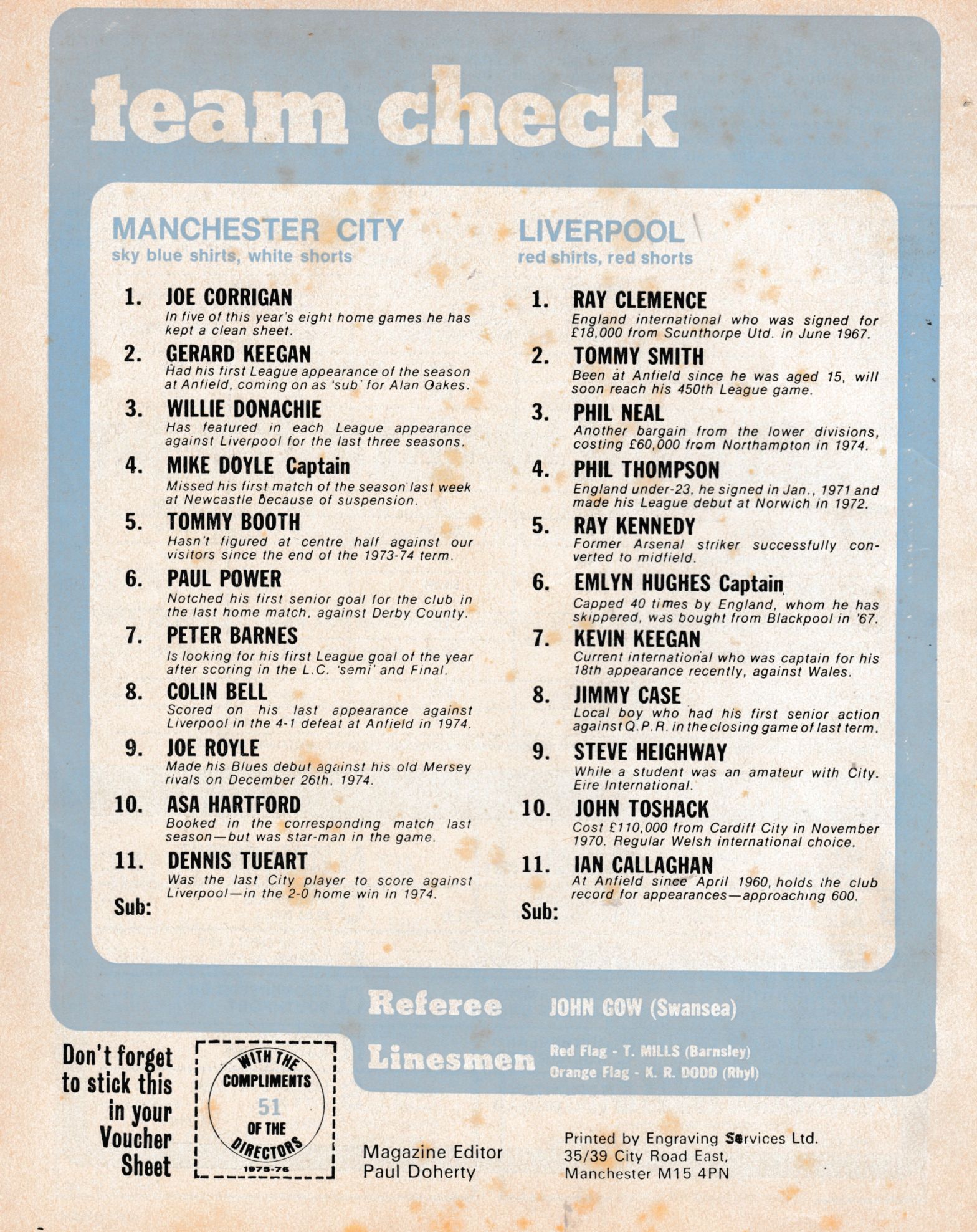 Paul Power came close to scoring a consolation goal a few moments later, as goalkeeper Ray Clemence and Emlyn Hughes scrambled the ball off the line, but the game ended 3-0 to new League leaders Liverpool, who led the table from QPR by a point. The Daily Express report praised City’s performance: ‘City stuck manfully to their job and until Fairclough began to create his havoc they always looked likely to take at least a point.’