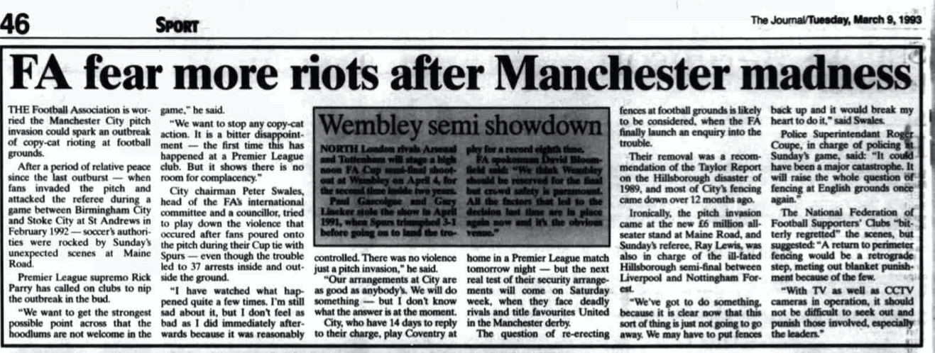 In 1993 the media claimed City fans were unhappy because they’d lost the FAC tie. Well, yes, but they’d lost plenty of other FAC ties over the years and never invaded the pitch. That tie became the visible outpouring of dissatisfaction, just like the European Super League has created a situation which has allowed United fans to bring more visibility to their longstanding protests against the club’s owners.