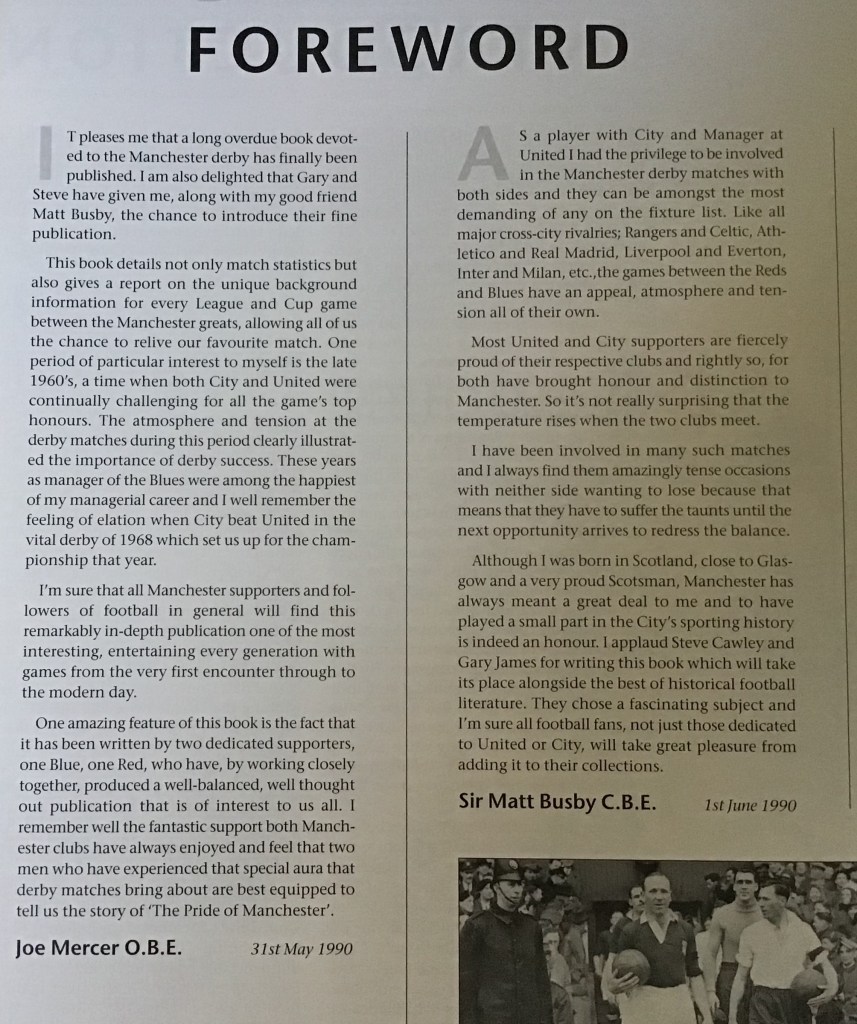 By that time I had already started work on my second book and I also knew that I wanted to write something specifically about Joe. I reasoned with myself that Joe’s book would wait until after my second book The Pride of Manchester was complete. The Pride of Manchester was a history of the Manchester derby co-written with Steve Cawley. Steve & I were quite fortunate in that, thanks to the connection with Joe, we also managed to ask Matt Busby to write a foreword too. To have the two men who were, by some way, at that time the two most successful managers of the Manchester clubs write our foreword and introduction was incredible. We were eternally grateful.