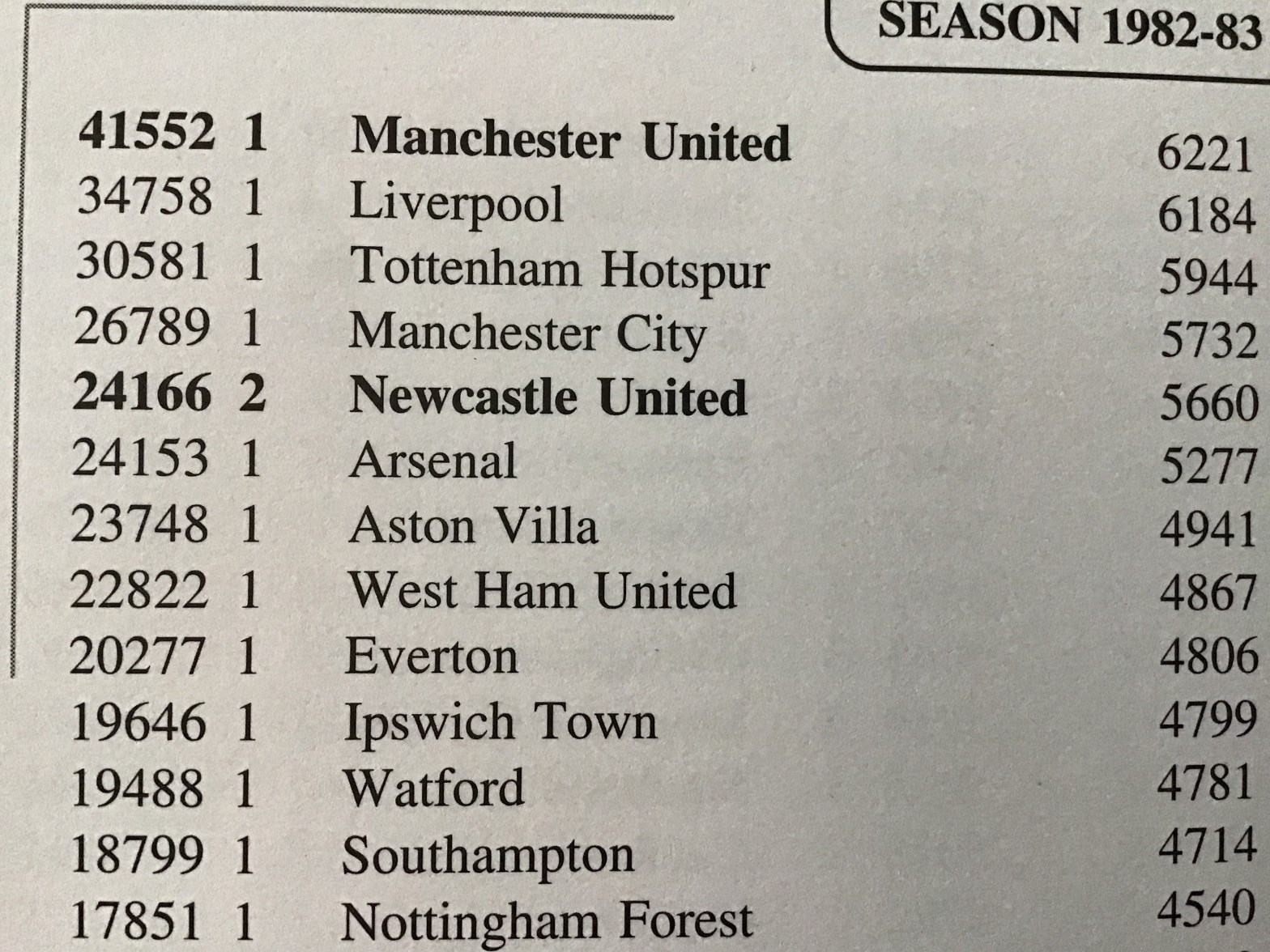 Fairly early on in the game between Manchester City and Arsenal the fans of the London club started to sing the old ‘Where were you when you were…’ chant. You’d think they’d know because often City were attracting better crowds than Arsenal. Let’s look at 1982-83 when I experienced my first relegation as a City fan. Back then City were the 4th best supported club (26,789) and Arsenal were 6th (24,153) – see the average attendance table above. City finished in a relegation position and Arsenal were 10th.