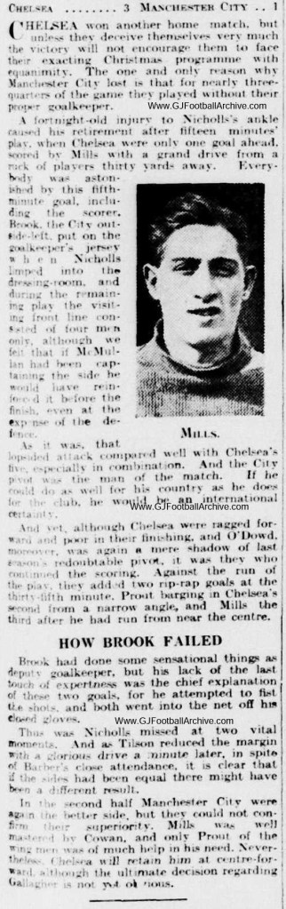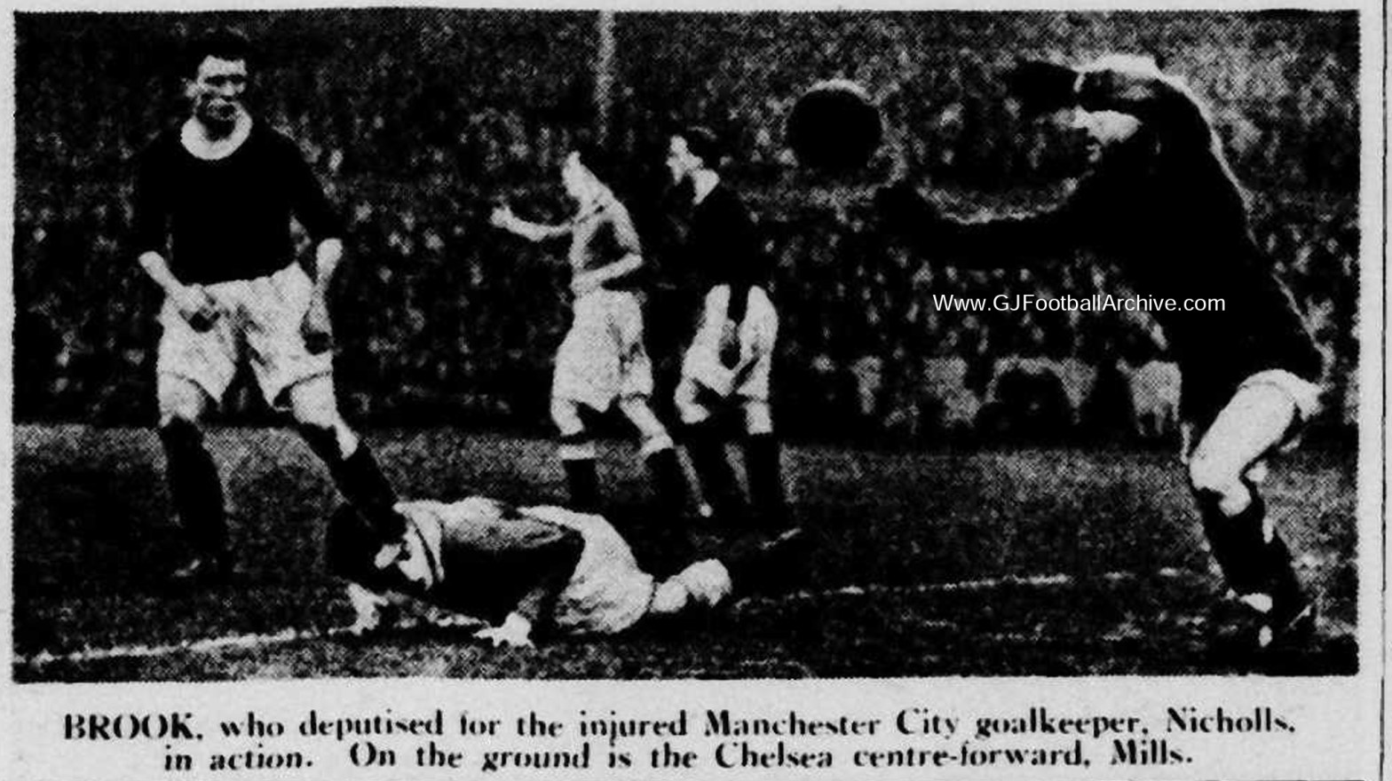 This weekend Manchester City face Chelsea and it’s reminded me of this newspaper cutting from the 1930s. I love this cutting showing Manchester City striker Eric Brook in nets v Chelsea. He was deputising for the Blues’ injured goalkeeper. It looks like Brook had a bandana on his head here too! The photo was taken on December 17 1932. You can read the match report here.