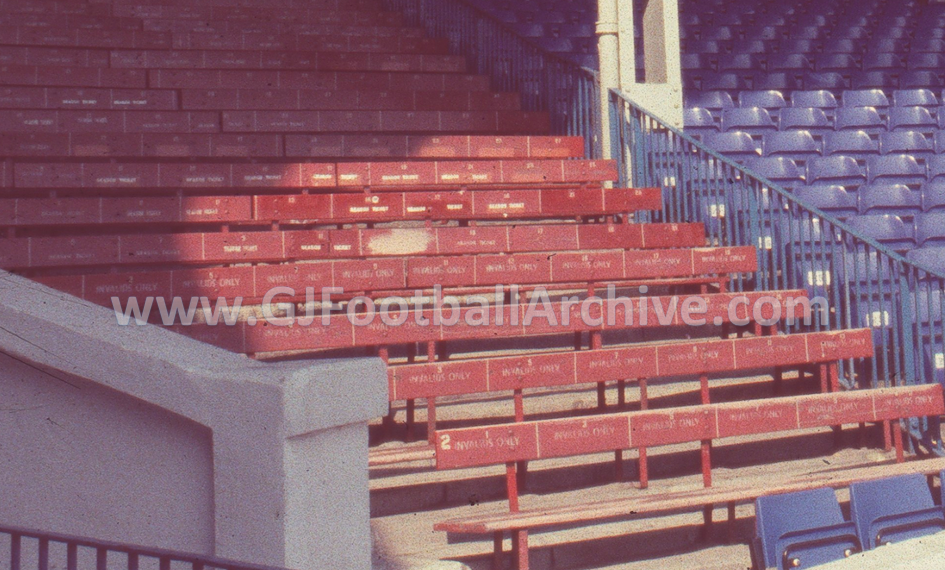 Most of the benches lasted about 40 years, but some were destroyed when Leeds United fans visited in November 1990 and were replaced for the stand’s final season or so with blue plastic seats. The stand was demolished in 1992.