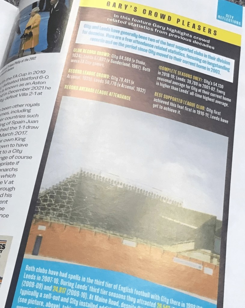 As seems to be customary these days the away fans chanted the ‘Where Were You’ chant. Surprisingly. It was within the first five minutes of the start. If only those fans chanting had read my programme articles today. One of them was my comparison of City & Leeds crowds. Reproduced below you can see how City actually increased the stadium’s capacity to cope with crowds when they dropped to their lowest point. The other attendance comparisons all work in City’s favour too.