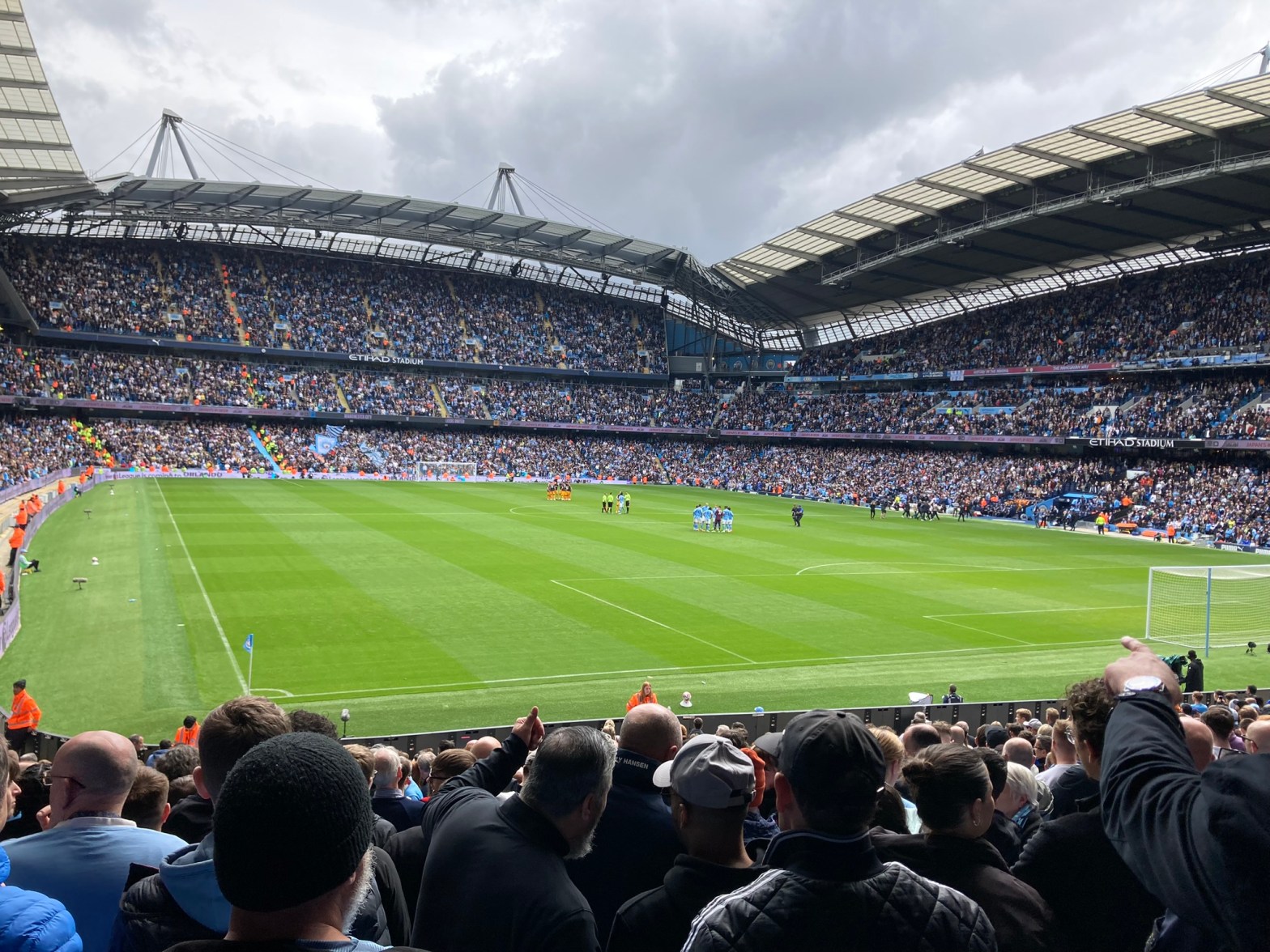 Looking towards the South Stand pre-match, City v West Ham 3 May 2023 (West Ham fans unusually did not sell out their allocation)