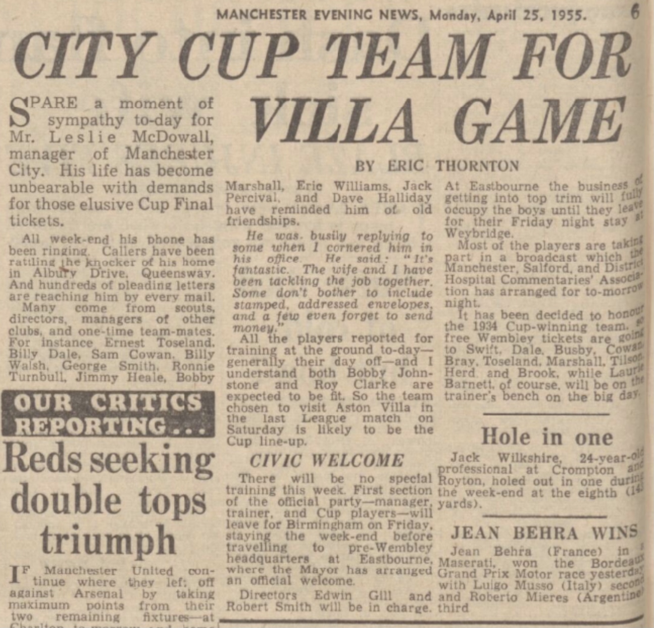 This is an odd article for a few reasons from today (25 April) in 1955. Basically the Manchester City manager Les McDowall was getting inundated with requests for FA Cup final tickets from fans, friends, former players and others. Some were turning up at his house…. So what did the Manchester Evening News do? It included the name of the street McDowall lived on! Surely that would’ve added to his woes?