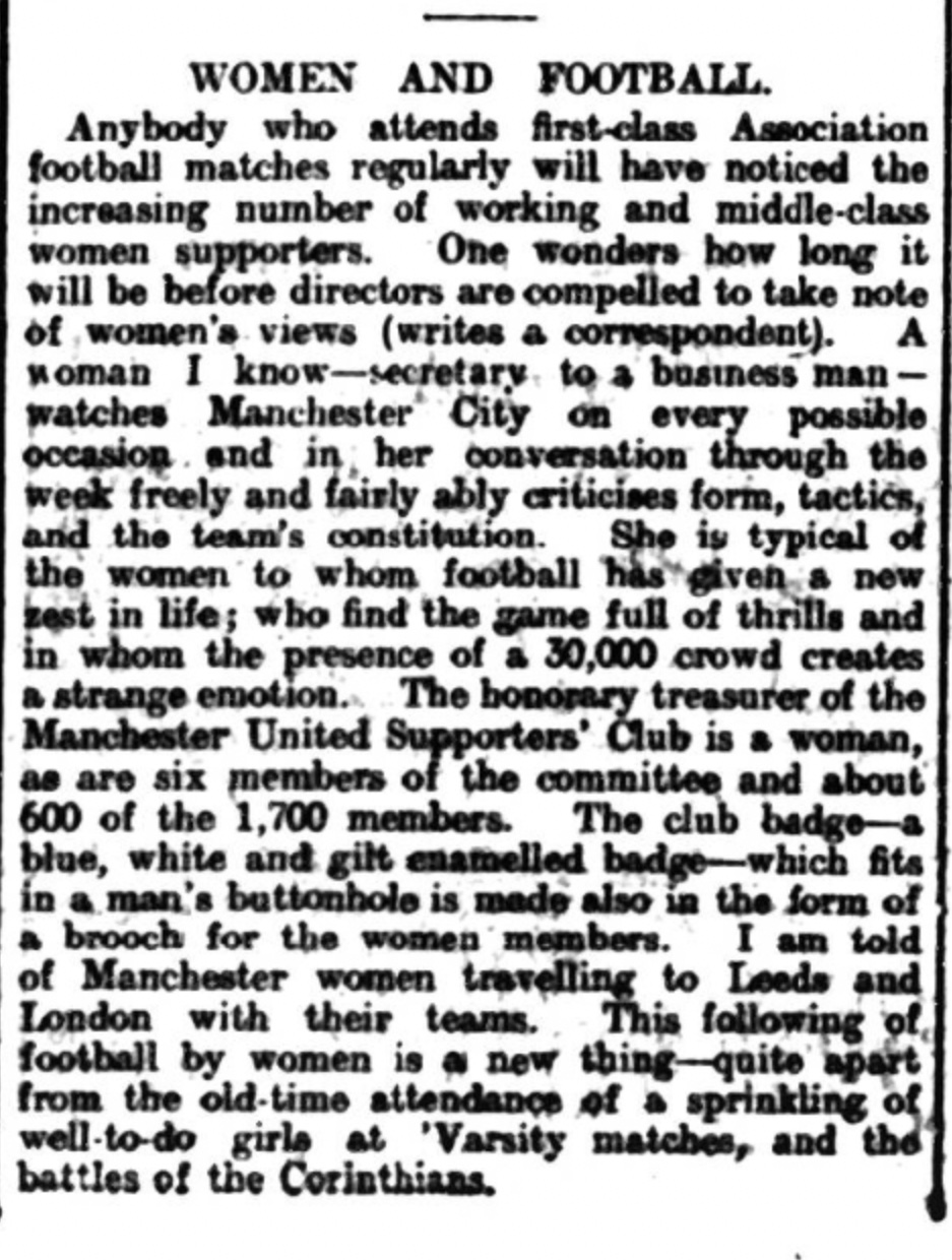 This week 100 years ago in Cumbria (as it’s now known) a local newspaper talked of the support both Manchester City & United received from women. This article suggested it was a new phenomenon but I’ve lots of evidence of female support at Manchester’s clubs goes back many decades before 1923. In fact City we’re issuing specially discounted season tickets to women from formation as MCFC in 1894.
