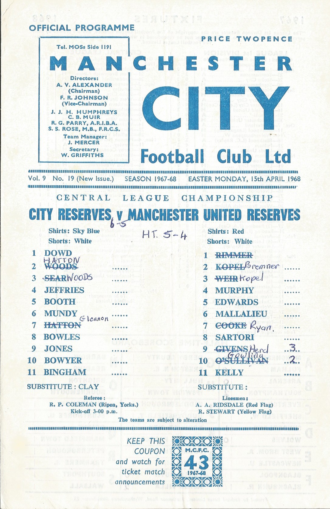 The game was played on 15 April 1968 and was watched by 2,503 (not quite the 20,000 remembered). City’s scorers were Mundy, Clay, Jones (2), Cunliffe and Bingham. The City starting 11 included Ricky Hatton’s father Ray: Dowd, Hutton, Woods, Jeffries, Booth, Mundy, Glennon, Clay, Jones, Cunliffe & Bingham.According to the programme (provided by Dave Masey) the half time score had been 5-4 to City and the United scorers were Herd 3 and Gowling 2.