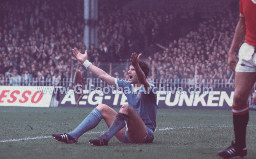 Day 6 of my posts counting down to the centenary of Maine Road’s opening game continues with another segregation image. This is a late 1970s Manchester derby image and the City player is Mike Doyle but look beyond him at the segregation and perimeter fencing. As well as the railings in front of the Kippax Stand the away section (to the right) has an additional chicken wire style temporary fence in front of the United fans.