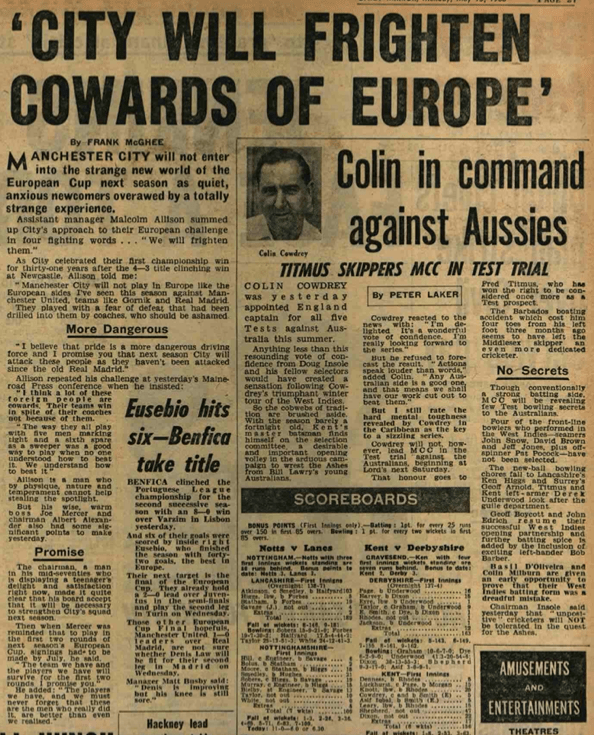 Manchester City at Sporting tonight… The great coach Malcolm Allison was a major trophy winner at both clubs, so here’s a feature on Allison’s Manchester City career with particular emphasis on his boasts, and City’s first European days for the Blues.