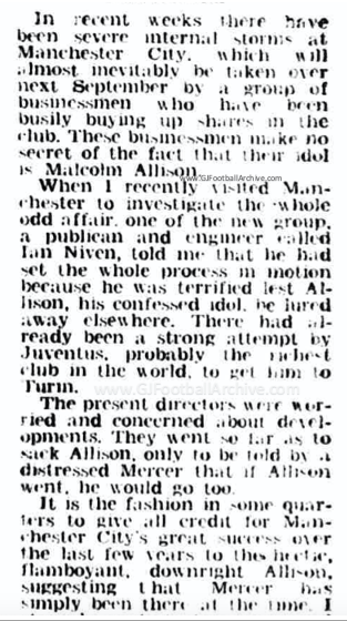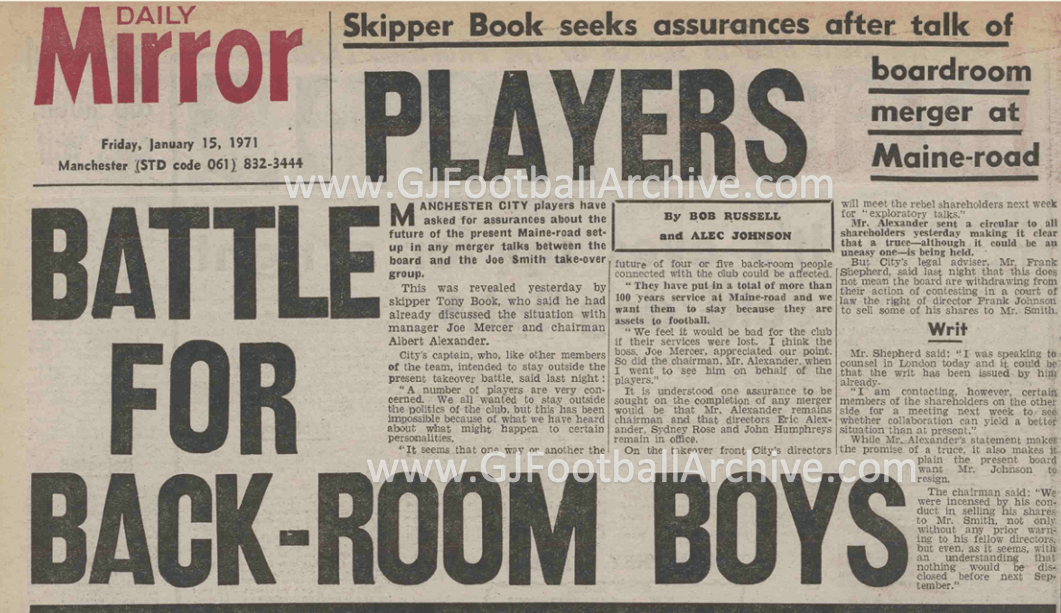The series of features/articles covering Manchester City in the 1970s continues with this newspaper reminder (published on this day – 15 January – in 1971) of the bitter takeover that killed off Manchester City’s period of trophy-winning dominance and ultimately led to Peter Swales becoming chairman. It’s something that dragged the first team into the takeover battle and pitted manager Joe Mercer and assistant Malcolm Allison on opposite sides. Those seeking to takeover the club, including future director Ian Niven, believed Joe Mercer contributed nothing to MCFC (he told me this himself in April 1989 – at that time Mercer remained the most successful City manager ever) and they split up the partnership. Not only that but they started the process which led to City being downgraded and becoming a fallen giant. Here’s another cutting from January 1971 which fits with the comments I’ve just made (that end line seems to be referring to Niven & others involved with the takeover):