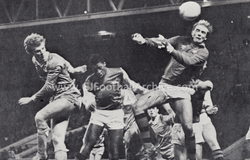 The photo shows central defender Caton sending a 52nd minute header past Arsenal ‘keeper George Wood, following an Asa Hartford corner. This gave City the lead at Maine Road but then five minutes from time the away team equalised. In the last minute another corner (this time from Paul Power) led to Caton leaping to send the ball home and give the Blues a 2-1 victory.
