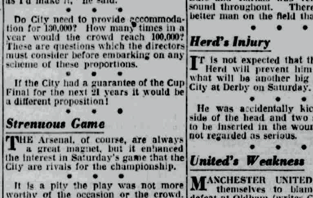 Day 57 of my posts counting down to the centenary of Maine Road’s opening game is a follow on from yesterday. It’s a cutting from the same newspaper, which was produced shortly after City and Arsenal had met at Maine Road in February 1935. It also follows on from some recent articles about stadium improvements. Here, the rumour was that City were planning to make Maine Road a 130,000 capacity venue.