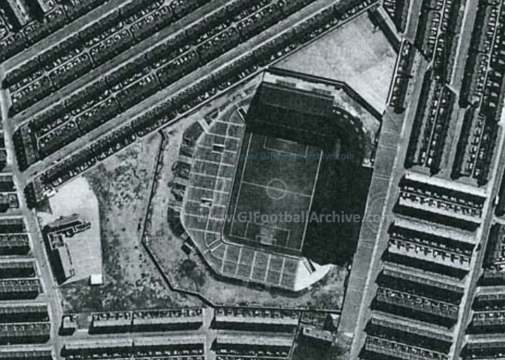 Notice how the Kippax/Popular Side terracing in the old photo is narrower the closer it gets to Thornton Road (top)… In a previous post I’ve talked about how they had to square off this terracing when they put a roof on in 1957 and how residents objected because they lost the Granada TV signal! See: