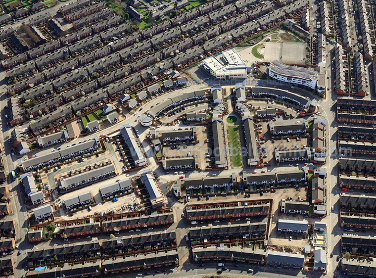 There are a few obvious consistencies between the two photos – mostly the old terraced streets which predated the building of the stadium. Maine Road itself is on the right and Kippax Street is the street that heads towards the terracing (from the bottom/Claremont Road) in the older image. In the newer image it leads into part of the new housing estate. Note the centre spot/circle in the new image. It appears further north than in the older image but that’s mostly the angle (having said that I’m not entirely convinced it’s in exactly the right spot – I’ve not yet compared actual plans but I guess the architects and planners did).