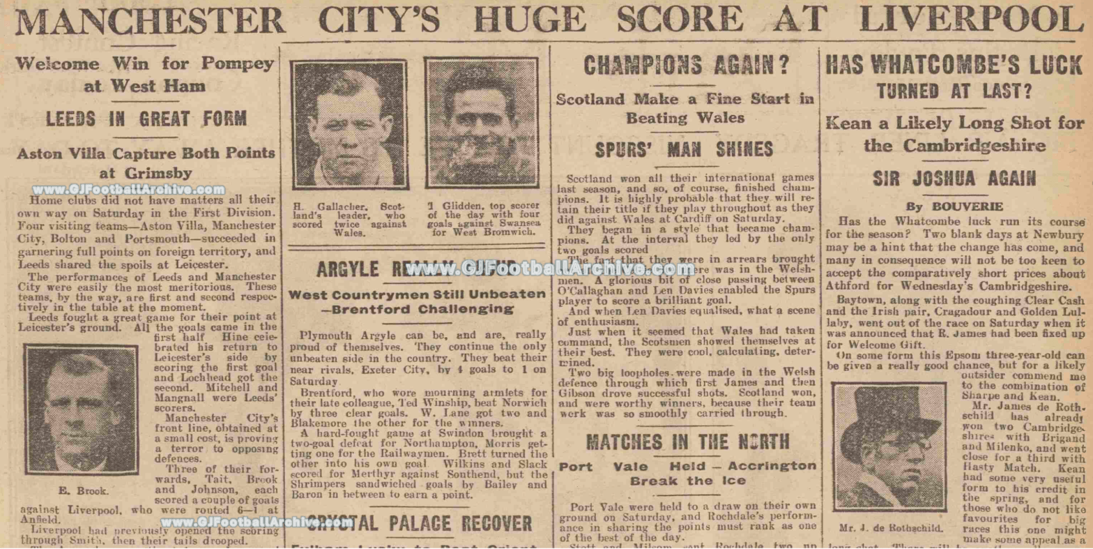 On this day (26 October 1929) Manchester City thrashed Liverpool 6-1 at Anfield with goals from Eric Brook 2, Tommy Johnson 2 and Tommy Tait 2. This match at Anfield was watched by 37,009. You can find out more on the 1929-30 season below in this piece for subscribers (see below). I hope you enjoy it. If you don’t subscribe then why not try it for a month (£3 per month or sign up for a year at a discounted £20 per year)?